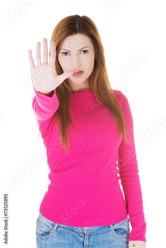 Angry woman gesturing stop sign