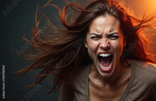Angry woman screams with open mouth. Portrait of stressed female with furious expression. Mad, enraged, aggressive, upset face. Negative emotion, cry, shout, rage. Frustration, stress, fear.