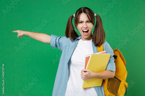 Angry young woman student in blue shirt backpack hold notebooks pointing index finger aside screaming swearing isolated on green background studio. Education in high school university college concept.
