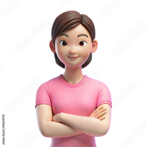 Animated 3D young girl in pink shirt with arms crossed, smiling confidently, on transparent background