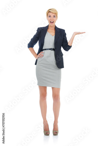 Announcement space, surprise or businesswoman in studio for loan offer, presentation or about us. Palm, white background or shocked financial advisor showing a sales discount, ads promotion or deal