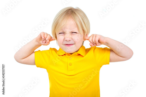 Annoyed boy covers his ears with fingers
