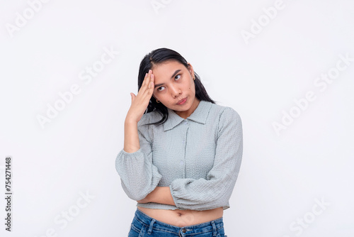 Annoyed young asian woman facepalms, expressing frustration and disbelief, with hand on forehead, isolated on a white background.