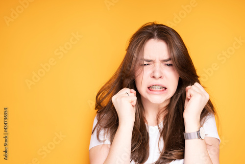 Annoyed young girl with braces suffering from dental pain clenching her hands into fists