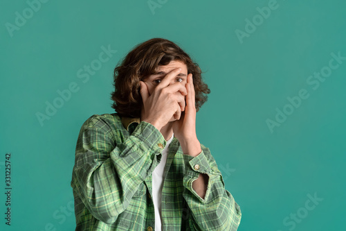 Anxiety and stress. Curly guy closing his face in fear on color background