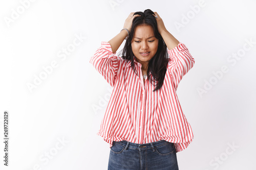 Anxious and troubled worried cute female staff in striped blouse feeling nervous and perplexed grab head with hands looking down bothered as thinking under pressure over white background