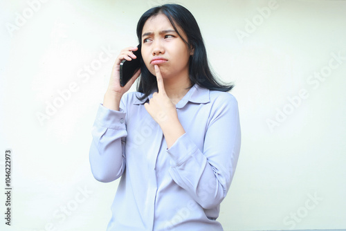 anxious worried asian young woman talking on mobile phone and thouch her chin with forefinger, female dressed in formal suit looking away, isolated over white background