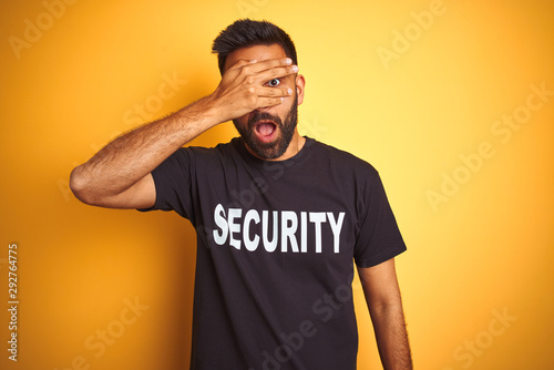 Arab indian hispanic safeguard man wearing security uniform over isolated yellow background peeking in shock covering face and eyes with hand, looking through fingers with embarrassed expression.