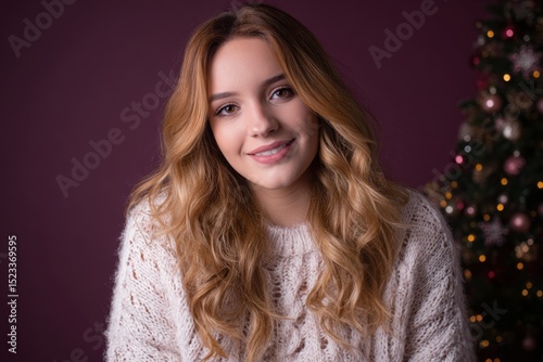 Arafed woman with long hair in a white sweater posing against a neutral background, natural light.