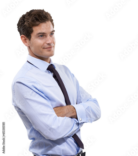 Arms crossed, business man and thinking for work isolated on a transparent, png background. Professional, employee and male person with ideas and inspiration for career vision and job success