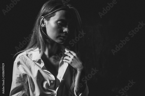 Art black and white portrait of a beautiful girl in a white shirt. Fashionable advertising photo of a young woman on a dark background