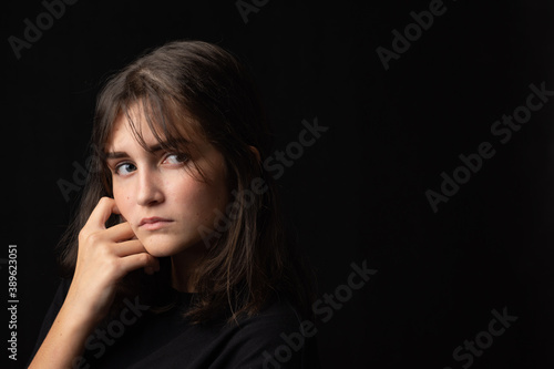 Art portrait of sixteen year old teenage girl in dark clothes on black background