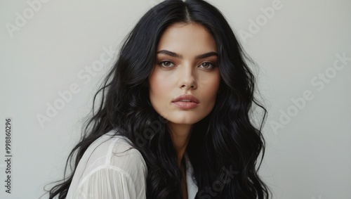 Artistic collage with a central figure of a woman with defined makeup and soft expression.