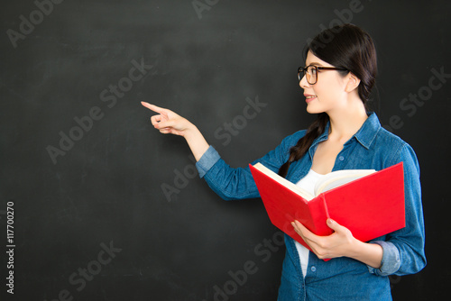 asia student presentation her work standing in front of blackboa