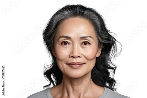 Asian beautiful gorgeous 50s mid aged mature woman looking at camera isolated on a transparent background. Healthy face skin care beauty.