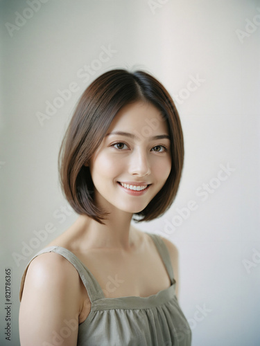 asian beautiful woman in white sundress bob shoulder length hair in white studio background