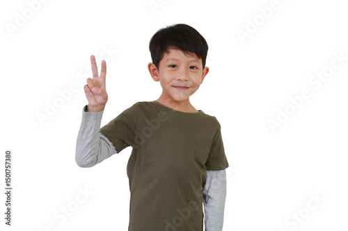 Asian boy kid age 8 years old showing victory sign fingers or fight gesture isolated on white studio background.