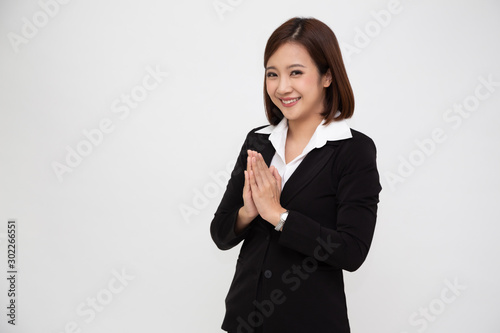 Asian businesswoman in black suit greeting action call Sawasdee of Thai traditional greeting isolated on white background