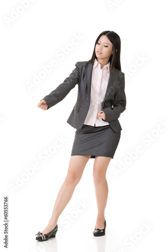 Asian businesswoman pulls an imaginary rope