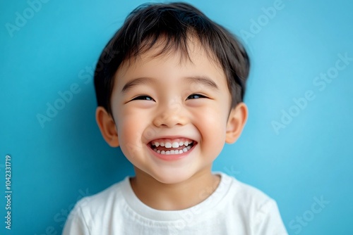 Asian child boy with almond-shaped eyes and light skin, laughing on a blue background 2