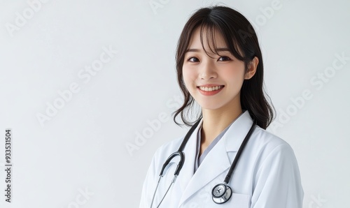 Asian doctor woman in professional medical attire, primarily a white lab coat, is set against a simple background that showcases her healthcare expertise.