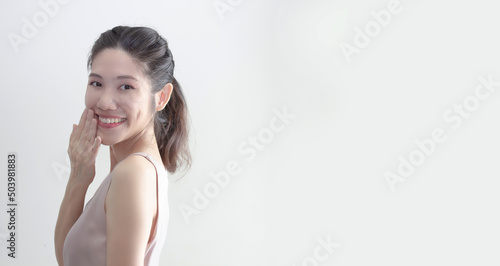 Asian embarrassed beautiful woman raise hand touch on lip and smile