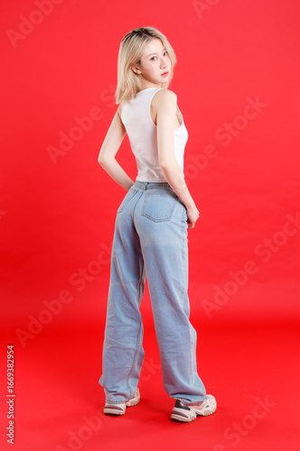 Asian fashion portrait young beautiful cheerful cute woman, blonde short hair wearing white tank top sleeveless light blue jeans, Gen Z confidently posing standing on red background looking at camera.