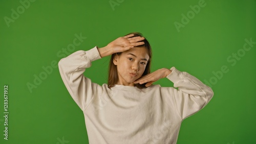 Asian girl child posing at camera like a model, touching face and makes cool poses, positive expression, isolated on chroma key green screen studio background mockup.