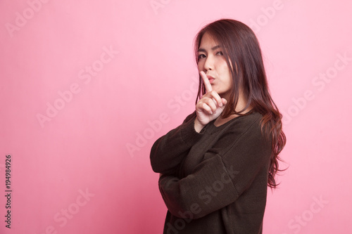 Asian girl show quite hand sign.