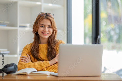 Asian girl student online learning class study online video call zoom teacher, Happy asian girl learn language online with computer laptop.