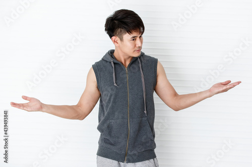 Asian handsome fit smiling man looking unhappy and angry showing rejection hands sign, wearing sleeveless t-shirt gray sportswear in white background.