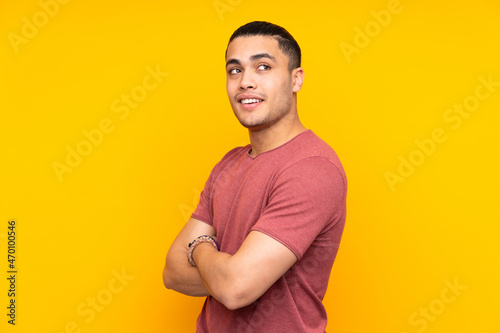 Asian handsome man isolated on yellow background with surprise expression while looking side
