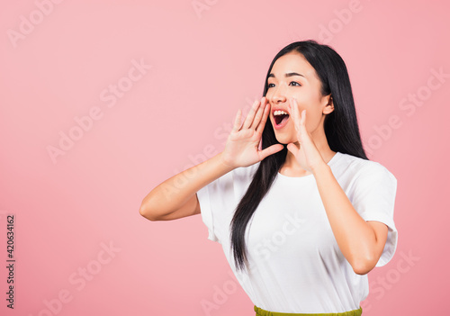 Asian happy portrait beautiful cute young woman teen standing hand on mouth talking news announcement studio shot isolated on pink background, Thai female looking to side away with copy space