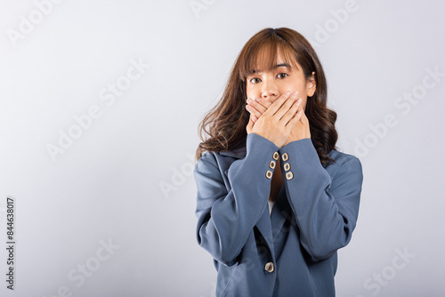 Asian happy portrait beautiful young woman standing smiling surprised excited her covering mouth with hands see only eyes and looking to camera on white background with copy space for text