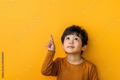 Asian kid looking upward surprised person finger.