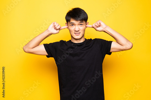 Asian man frustrated and covering ears over isolated yellow wall