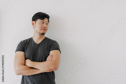 Asian man in black t-shirt crossing his arms isolated on white wall.