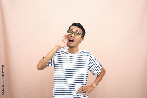 Asian man in glasses wearing casual striped shirt, shouting pose with hand near mouth, giving information. Isolated beige background.