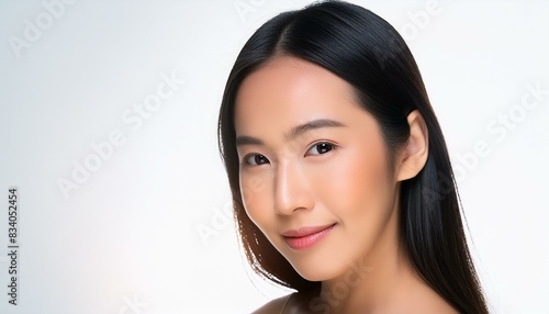 Asian model woman face close-up with natural smooth skin, beautiful eyes, and long black hair with natural light from sunlight isolated on clean white background