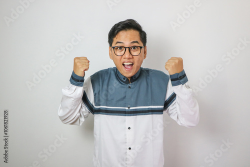 Asian muslim man holding smartphone doing winning gesture, Happy get special gift online, isolated on white background