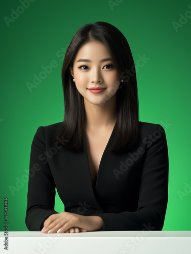 Asian news anchorwoman is sitting in front of a green screen, ready to present the news
