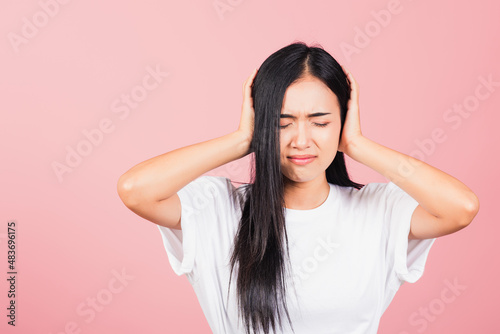 Asian portrait beautiful cute young woman have closed ears with hand palms and close eyes, studio shot isolated on pink background, Thai female covers ears for loud noise with copy space