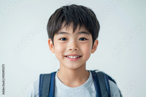 Asian teenage student carrying school bag on white background, student happy back to school