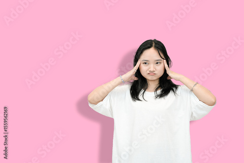 Asian Teenager Girl in a Thinking Pose, Hand on Chin, Pink Background