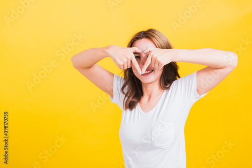 Asian Thai happy portrait beautiful cute young woman smile standing make finger heart figure symbol shape sign with two hands and looking camera, studio shot isolated yellow background with copy space