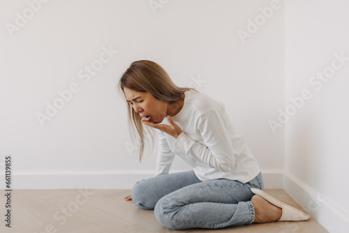 Asian Thai woman feeling sick and queasy, cover mouth, has a stomachache cramp in white sweater, sitting on floor in white apartment room in winter.