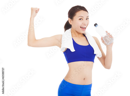 asian woman drinking water and muscular pose