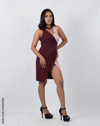 Asian woman full body. Thai woman in a modern chic style stands in white studio with elegant and confident pose. Casting model supporting actor actress. Asian woman fullbody pose in front of camera.