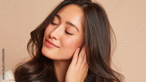 Asian Woman Gently Touching Smooth Shiny Hair with Natural Makeup, Soft Pastel Background in Elegant Haircare Concept