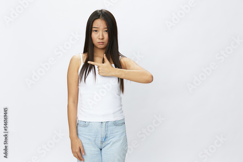 Asian woman hand signals, finger pointing facial skin problems, acne and inflammation, red rash and allergies, chicken pox, sadness from rashes. Facial skin care concept for diseases and nerves